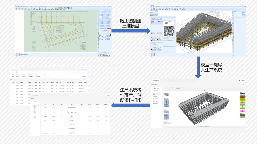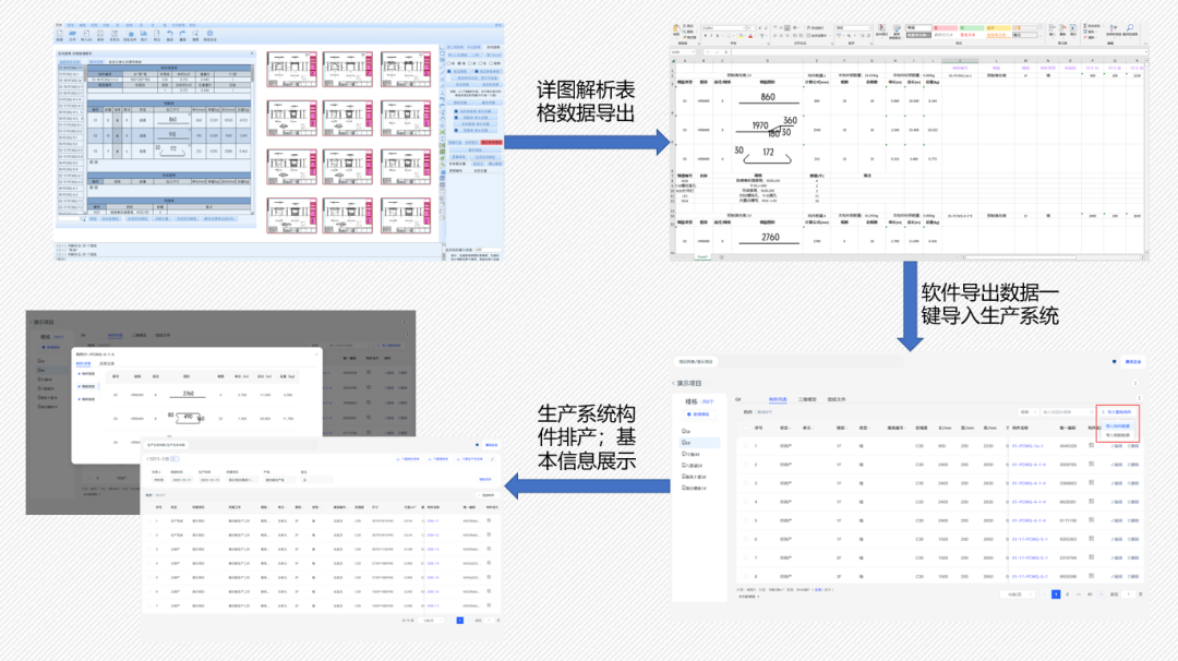 对于没有深化设计部门的构件厂,系统提供了反向解析功能。通过解析详图中的构件信息,汇总数据生成Excel表格。反向建模软件默认导出的表格与生产系统高度适配,可不经修改直接导入到生产系统中。表格导入因无法取得构件位置信息,无法搭建生产模型。