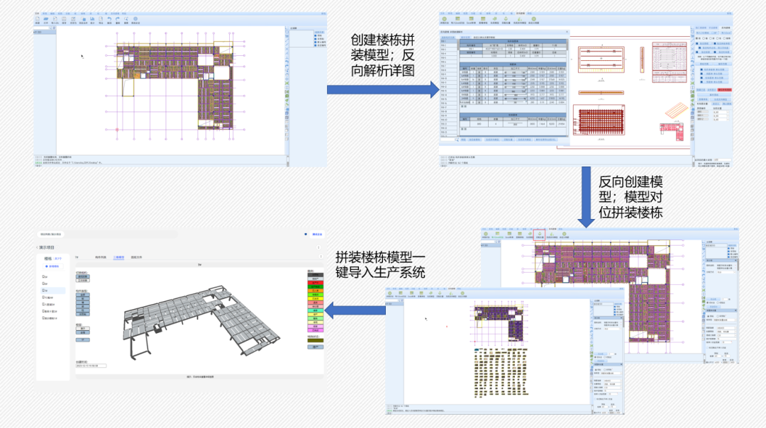 如若没有深化设计部门,但又需要搭建生产模型,则可通过反向建模功能实现数据的导入。用户需在反向建模软件中,提前通过施工图创建楼栋模型,而后反向解析详图数据并生成实体/虚拟模型,再将所生成的模型拼装到楼栋模型中,实现生产构件的位置关系确认。并通过Web BIM模型链接的形式一键导入到生产系统中。